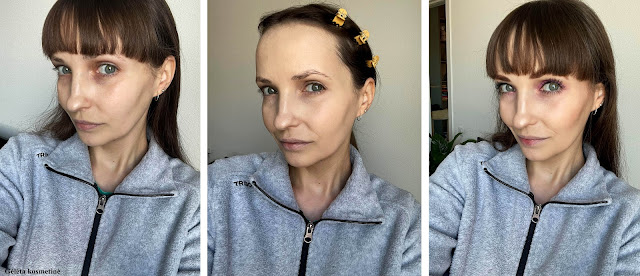 Kreminė pudra yra silikono pagrindo, todėl gražiai gula ant veido odos, palygina odos tekstūrą, tačiau pirmos sluoksnio maskavimas nėra intensyvus (nuotraukose be maskavimo priemonių), o antras sluoksnis man labai jaučiasi ant odos, tad jo paprasčiausiai nedengiu ant odos - nepatinka, oda jaučiasi perkrauta ir apsunkinta. Apskritai efektas nėra prastas - pirmas sluoksnis atrodo natūraliai, pudra palygina odos paviršių, suteikia maskavimo ir kartu atrodo natūraliai - kasdienai tokio efekto visiškai pakanka, ant odos jaučiasi visai gerai. Jei sluoksniuoti, tai storesnis sluoksnis šiek tiek sukrenta į raukšleles, tad jei dengiu, tai tik plonyčiu, permatomu sluoksniu.